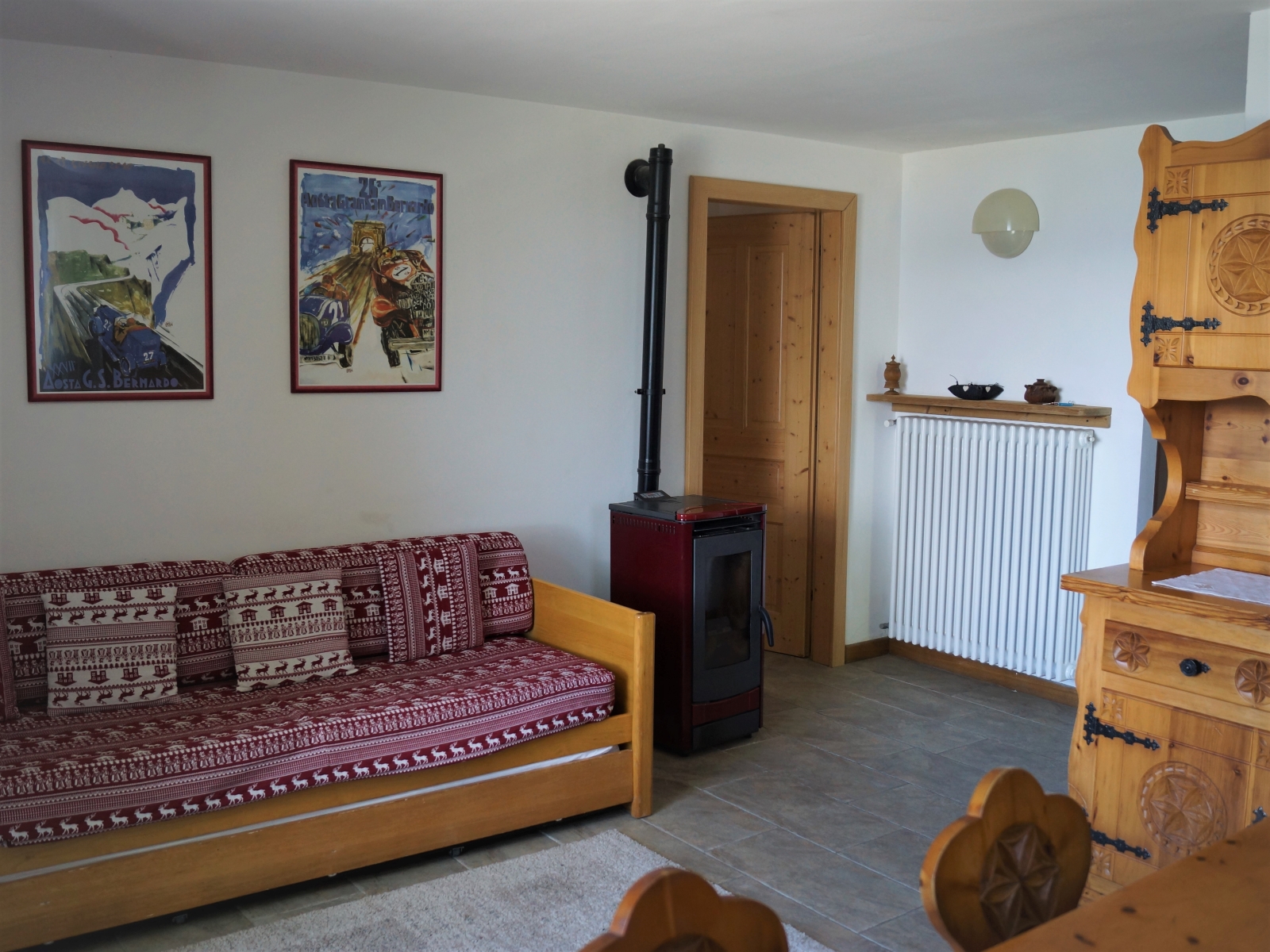 Beautiful apartment of around 60 m2 with separate entrance and private garden. It includes an entry, a large living room with a splendid view of the city of Aosta and the Grand Combin, two bedrooms, a separate kitchen and pantry and a bathroom. The windows of the two bedrooms open up to the peaceful mountain prairie and offer a beautiful view of the mountain peaks Emilius and Becca di Nona. The apartment has been completely renovated and refurbished with care by the owners over the summer of 2008.